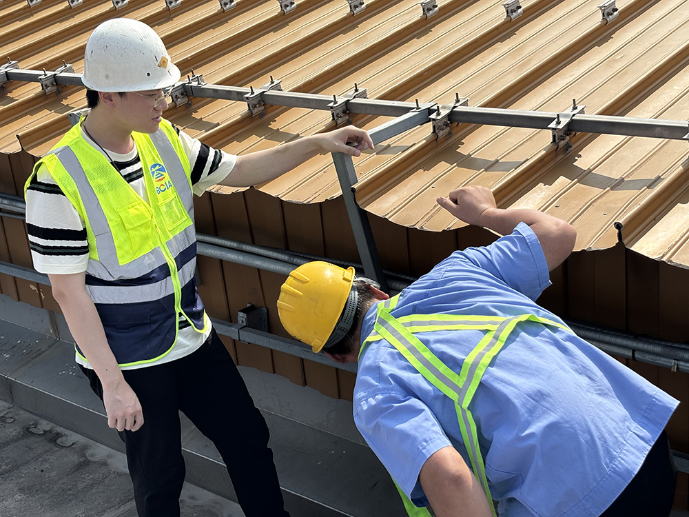 7月12日,在3號航站樓屋面溫度突破50攝氏度的極端時段,丁博嚴來到作業(yè)現(xiàn)場。他注意到天氣預報顯示午后可能有短時強風和降雨,特意趕來檢查新更換天窗采光板的固定情況?!霸趧傞_始更換天窗采光板時,發(fā)現(xiàn)尺寸與舊結構不匹配,及時返工才避免了漏雨。咱們在工程上必須小心謹慎,才能避免今后雨季的隱患”。他很少說教,但工人們都記得他那句樸實的話:“現(xiàn)在多流一滴汗,雨季就少修一個漏?!痹谶@個滾燙的夏天,這個離天空最近的“戰(zhàn)場”記錄著比溫度更高的熱情。