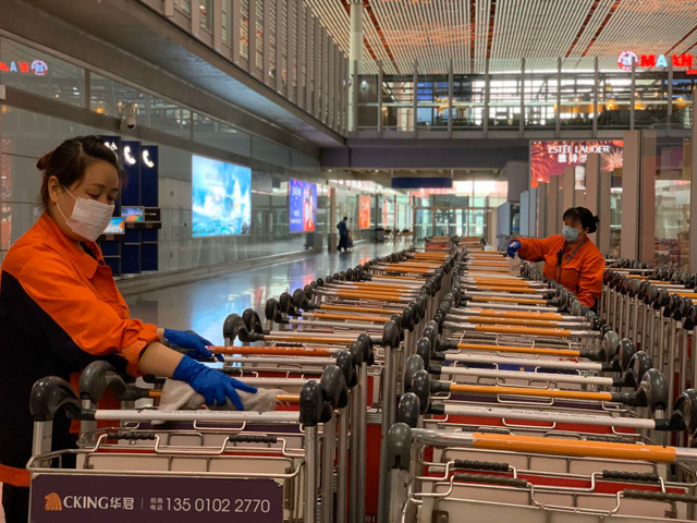 針對(duì)旅客接觸最多的手推車(chē),首都機(jī)場(chǎng)安排了保潔人員進(jìn)行專(zhuān)項(xiàng)分批次消毒,并對(duì)手推車(chē)扶手和行李可接觸到的區(qū)域進(jìn)行重點(diǎn)消毒。經(jīng)過(guò)集中消毒后的手推車(chē),由專(zhuān)人進(jìn)行放置,供旅客使用。3座航站樓內(nèi)手推車(chē)日均消毒6.9萬(wàn)余輛,童趣車(chē)和嬰兒車(chē)日均消毒700余輛,保障不同需求旅客的出行安全。此外,自2020年2月7日起,首都機(jī)場(chǎng)還新增對(duì)3座航站樓的安檢筐、ATM機(jī)、移動(dòng)充電設(shè)備消毒,僅安檢筐的日均消毒量就達(dá)1.24萬(wàn)次。