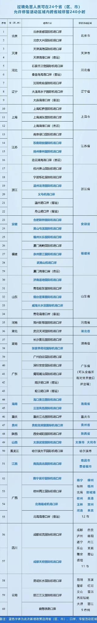 符合上述條件的外國人,可向中國北京、上海等地的60個(gè)口岸的邊檢機(jī)關(guān)提出申請,邊檢機(jī)關(guān)將為其辦理臨時(shí)入境手續(xù),免簽停留時(shí)間自入境次日零時(shí)起算。符合與我國簽署互免簽證協(xié)定或我單方面免簽政策的,可從其規(guī)定。
