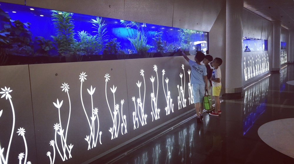 T2連廊口設(shè)置了集“水族觀賞、合影留念、投影互動(dòng)”于一體的T2“海底世界”景觀走廊,新加入的投影互動(dòng)系統(tǒng),將T2“海底世界”的動(dòng)態(tài)影像投影于地面,在紅外系統(tǒng)的監(jiān)控下,旅客腳步踩過“水面”,游魚會(huì)“匆匆”游走,不經(jīng)意間的高科技互動(dòng)體驗(yàn),為旅客帶來了意外的歡樂。