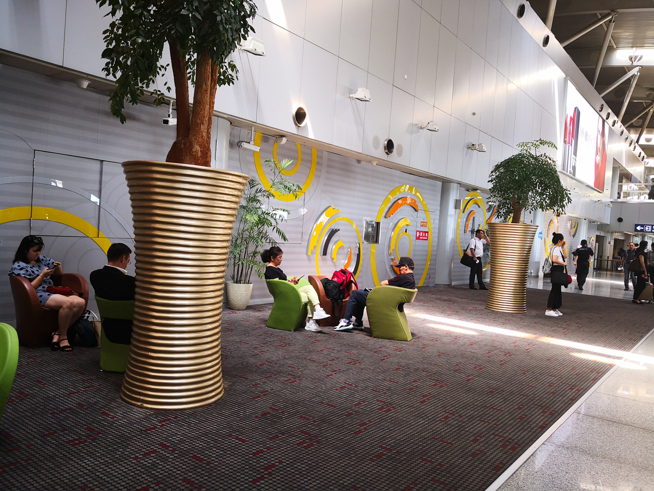 在T2國內(nèi)23號登機口設(shè)置了“五光十色”藝術(shù)休閑區(qū)域,供旅客休息。
