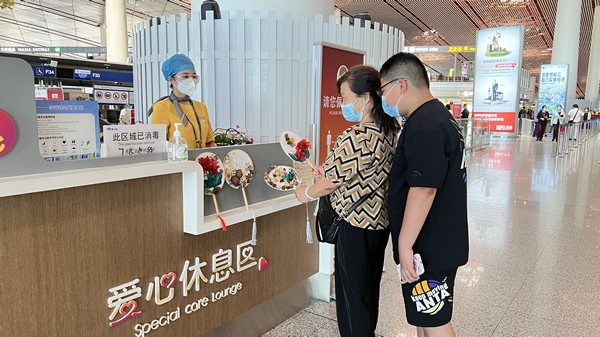 暑運(yùn)期間,隨著老年旅客和兒童旅客的增加,首都機(jī)場航站樓暖陽團(tuán)隊(duì)在每個(gè)柜臺(tái)配備了飲用水、藿香正氣水、風(fēng)油精、十滴水等清涼解暑物品,供有需要的旅客使用。同時(shí),團(tuán)隊(duì)成員充分發(fā)揮自己的想象力和主動(dòng)性,DIY 出獨(dú)具特色的團(tuán)扇,贈(zèng)送給前來愛心休息區(qū)休息的老年旅客,得到了旅客們的一致好評(píng):“扇子非常精美,也很有意義。在疫情這個(gè)特殊時(shí)期也能感受到來自首都機(jī)場的濃濃的關(guān)愛,在這炎炎夏季讓我們感受到了絲絲清涼”。