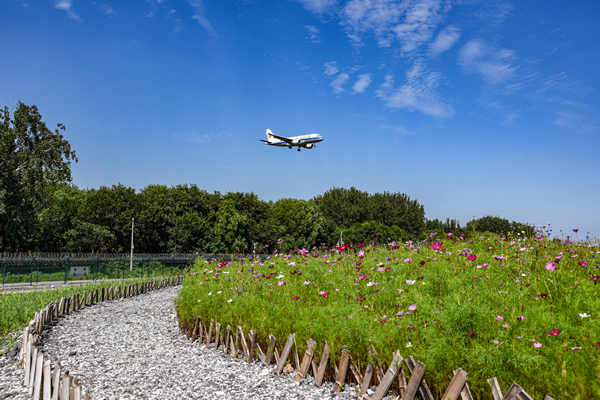 首都機場西跑道北端由北部土坡區(qū)、南部平整區(qū)以及排水明溝等區(qū)域構成,總面積約3.3萬平方米。該區(qū)域原為渣土堆,堆放了較多建筑垃圾,容易吸引鳥類停留,環(huán)境治理難度較大。面臨種種挑戰(zhàn),首都機場飛行區(qū)管理部積極創(chuàng)新工作思路,以人工種植的草坪為基底,選擇4種—5種適合北方地區(qū)生長且不吸引鳥類的草種整體分區(qū)種植,并搭配種植小面積波斯菊,在西跑道北端打造了一片花海。