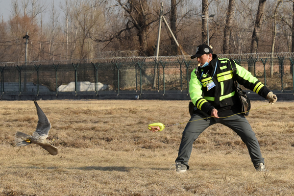 其中,針對(duì)機(jī)警的集群小型鳥(niǎo)類,首都機(jī)場(chǎng)在跑滑區(qū)域鳥(niǎo)網(wǎng)桿頂部增加了泛光飄帶、彩色風(fēng)輪等視覺(jué)設(shè)備進(jìn)行干擾,同時(shí)組織人工驅(qū)鳥(niǎo)隊(duì)伍采取視覺(jué)、聽(tīng)覺(jué)震懾驅(qū)趕等措施,避免鳥(niǎo)類逗留。而針對(duì)大型猛禽,首都機(jī)場(chǎng)則采用獵鷹驅(qū)鳥(niǎo)為主、“土方”捕捉為輔的方式,鷹舍獵鷹“傾巢而出”,“絆腳籠、鷹叉、鴿衣”等各種民間驅(qū)鳥(niǎo)方式各顯神通,收到了良好效果。