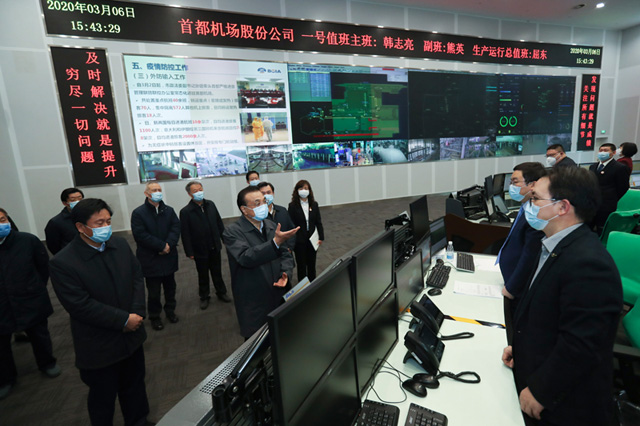 在機場運行控制中心,李克強聽取疫情發(fā)生以來全國航班運行、人員出入境、貨物進出港等情況匯報,對民航系統(tǒng)保障醫(yī)務(wù)人員和抗疫物資運輸、開通點對點航班幫助重點行業(yè)農(nóng)民工返崗復(fù)工表示贊許。