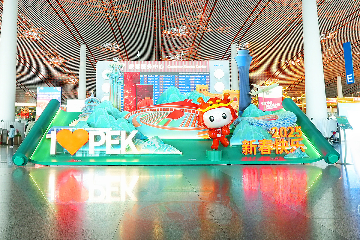 春運(yùn)期間,首都機(jī)場(chǎng)上新樓內(nèi)景觀,為往來旅客呈現(xiàn)了一場(chǎng)別開生面的視覺盛宴。在3號(hào)航站樓內(nèi),一幅絢麗的新春畫卷徐徐展開。以綠色卷軸打底,景觀巧妙地融入北京標(biāo)志性建筑,俏皮可愛的首都機(jī)場(chǎng)服務(wù)品牌IP“都都”和“新春快樂”4個(gè)大字仿佛在向每一位旅客熱情地打招呼,傳遞最真摯的新春祝福,讓旅客感受到新春的喜悅。